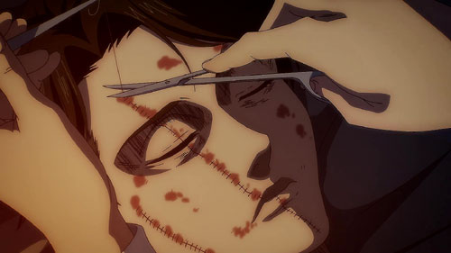 After escaping from the pursuing Jaegerists, Hange sets up camp in the forest and stitches up Levi's wounds. As she finishes, they receive Eren's message to the Eldians via the Paths.