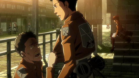 After partially transforming himself to protect Armin and Mikasa, Eren climbs out of the Titan to talk with Mikasa and Armin regarding the basement in his former house and how he believes that it holds the secret to mankind's preservation and the key to destroying the Titans. Commander Kitz is still afraid and once again orders the cannon to be loaded. Eren comes up with two plans of escape: the first is for him to transform into a Titan and run away on his own, forever criminalizing himself in the eyes of humanity. The second is to have Armin convince Kitz that Eren is an asset, not a danger. Armin has several flashbacks and comes to the realization that even if he is a coward physically, he can still defend his friends regardless and decides to talk their way out of being executed. Armin tentatively convinces Kitz, only to have him overcome by fear and give the order to fire once more. But the order is halted when Commander Pixis and his men intervene, sparing their lives. In return, Pixis asks Eren if he will transform himself to block the gap in Wall Rose to prevent further Titan invasions. He agrees, regardless of whether or not he is able to control his Titan form.
