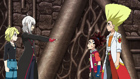 While Aiga is angrily insisting he and Achilles are one, the large gate opens, and to everyone's surprise Valt enters. He brings bey bread to the boys. Just as Shu and Valt discuss the completion of their Super Z beys, Hearts makes an announcement. It's time for another Dead Gran show. Did Hearts somehow bring Shu and Valt to them just to show them how badly he'll crush Aiga?? Well... Aiga's attitude needs an adjustment so will he become a Hearty snack?