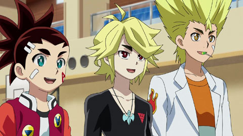 The principal of Beigoma Academy has given the Bey Club and the Wild Bey Gang a present for their accomplishments in the World of Beyblade. It's a brand new shiny two-floor stadium! He suggests they start with a six-man battle royale. The battlers will be Aiga, Fubuki, Ranjiro, Tokonatsu, Koji, and Suoh (welcome back)! To everyone's surprise, the principal will fill in as the referee complete with uniform.