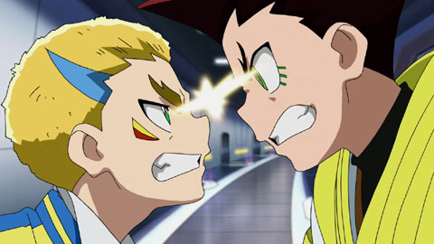 It's down the to last eight bey battlers in the Bey Carnival event. Amane is paired up with Joe. Just as he predicted, Joe has won his battle against Amane.
