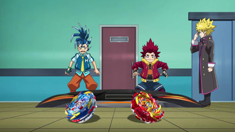 Wakiya, a self-proclaimed exclusive coach, invites them to his house again. First up...food. After their lunch of Okonomiyaki, Aiga and Ranjiro arrived. They all head over to Wakiya's training room where they find Drum. Wakiya says he'll train them all. He pulls out Jet Wyvern, a product of Komurasaki-funded research, and the ultimate defense-type bey.