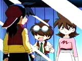 It is sunset at the riverside park, and Tyson can’t find Kenny anywhere. He finds Kenny’s glasses and begins to wonder, since Kenny never takes them off. Suddenly a black van drives by, almost hitting Tyson. Tyson hears his name screamed. Kenny and Hillary are prisoners in the black van! Tyson runs after the van and lunges for the back door, but it veers and he crashes painfully into the ground. The van screeches away. Tyson picks himself up and tries to pursue, but it is gone. A nearby payphone rings. Tyson answers, and Slim’s voice announces that he has Kenny and Hillary. Hidden cameras in the phone booth transmit Tyson’s reactions back to Evil Organization Headquarters, where Gideon and his scientists are monitoring everything. The voice says Tyson must follow his instructions if he wants his friends released. Tyson must get to a stadium in 5 minutes, and to pick up a payphone by the third ring. It’s an impossible run! Tyson takes off, while Ozuma observes from a nearby rooftop. As Tyson runs, he wonders what is going on. In his back pocket, Kenny’s glasses pulse. The glasses have been altered or replaced by electronics that are monitoring Tyson’s vital signs. Back at HQ, Gideon goats that Dragoon will show himself soon enough, and then he would be his!