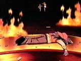 Tyson’s blade has been knocked out, round two goes to the robot. As punishment, the prison walls start to close in on Kenny and Hillary . Tyson pleads for one last chance. The voice agrees, and laughs evilly. Tyson launches and attacks with an intensity and concentration we haven’t seen yet this season. Suddenly the monitors at HQ explode, and Dragoon finally bursts from Tyson’s blade and attacks. Gideon orders his men to capture the bitbeast. The scientists activate a prototype bitbeast capture system. Emitters emerge from the robot, and energy whips snare Dragoon. Gideon gloats that Dragoon will now be his. But Dragoon breaks free, and swoops down and destroys the robot in a fiery explosion. The robot’s beyblade is knocked out. The walls stop closing in, and Kenny’s and Hillary’s prison opens up. Dragoon returns to his blade. The entire ship’s hold is in flames, and Kenny and Hillary find Tyson unconscious, facedown on floor next to the bey-stadium. Hillary grabs Dragoon’s blade, still spinning, and Kenny and Hillary haul the unconscious Tyson away.