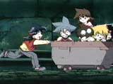 Down in the tunnel the Bladebreakers’ mine car is whizzing downhill far too fast! Max and Ray find a brake lever and pull on it together, trying to stop the car, but it’s not working. The tracks ahead are blocked by a rock fall, but Kai launches his beyblade at a switch and changes them to some side tracks. The team sees light ahead . . . and the end of the tracks! Max and Ray haul furiously on the brakes, and manage to stop the car just as the tracks end.