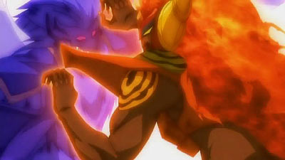 After many crushing rounds, each blader initiates their special move. Pegasis Bahamut's is "Final Ultimate Demolition", while Zyro uses "Burning Tornado Fire". An explosion occurs. Shinobu covers Maru to shield her from harm (what a great guy!). The explosion, also, resulted in Gingka's release.