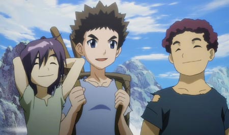 A young boy is trying desperately to destroy a large boulder with his fist, but he is having no luck. He hears voices and slips behind the rocks. The voices belong to Sho and the others traveling the mountainous path in search of arenas. Suddenly, there is a rock slide. Jin calls to the others to "GET BACK" while he uses his strength to disintegrate the approaching boulders.