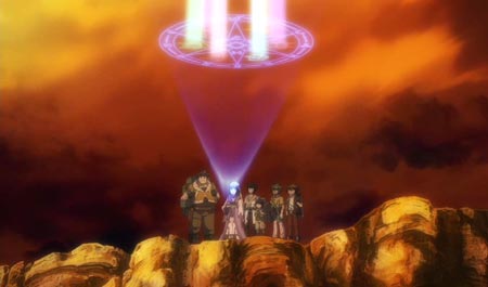 All guiding lights have appeared leading the way to the Sacred Garden. Sho and the group are lead to a mountain peak. Once on top, they find Task and Armes. Jimmy spots the door to paradise...a legendary door that's said to lead to the Sacred Garden. It looks just like the arena doors. Rachel opens the door with her compass-like apparatus. The Sacred Garden looks like a floating island. Passing through the door takes them to it.