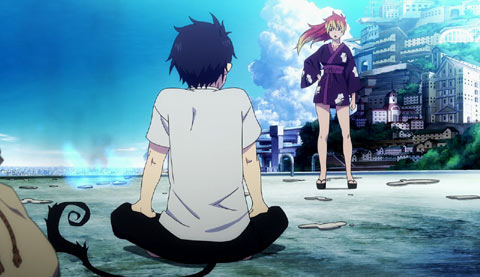 The episode opens with Rin trying to control his blue flames. Shura gets a call that she is needed, and Rin accompanies her as he is under her watchful eye.