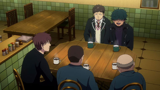 Lightning and Bon question the priests within Yukio and Rin's home.