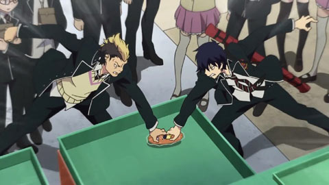 Mephisto has given the boys a small allowance, but it isn't much help when it comes to meals. However, they learn that Mephisto's familiar, Ukobach, is preparing their meals for them. At the school, Yukio is adored by three young girls who have prepared lunches for him, but he makes excuses not to accept them.