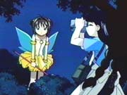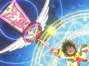Evening falls once again. Sakura gets into a yellow fairy costume and Madison films her, commenting how great she looks. Sakura uses the fly card to circle towards the clock tower when they.... start to.... slow.... down.... until they.... stop. The time then goes back to where they're ready for lift off. Kero says it's the Time card and explains about time slips as they fly towards the clock tower again.