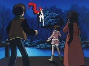 After a while, Sakura asks Toya if he would get them some juice, and they would wait at the Moon Mirror pond. While at the pond an unseen Eriol conjures up a white horse that charges at Sakura. A quick thinking Sakura summons the wood card. The limbs wrap themselves around the horse, capturing it. Unfortunately, it breaks free and backs into a power line that supplies electricity to the Festival. The lights begin to blink and go out. Syaoran takes a shot at the unruly horse. "Thunder God, answer my call!" he shouts. It didn't work. Next step is the two work together. Syaoran calls Wind to blow the horse into the pond, and Sakura uses Thunder to give it a final shocking.