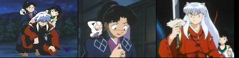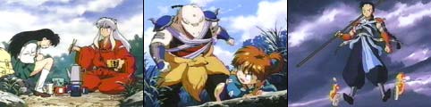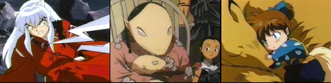Kagome is enjoying a swim in a small lake when a speedy white monkey grabs her clothes. The monkey takes the clothes to a boy who expected to find food and not Kagome's undergarments. InuYasha and Kagome approach the boy and demand the clothes back. After a rocky start, the boy reveals his name as Nobunaga. At first Kagome is excited...thinking he is the famous Oda Nobunaga, but disappointment sets in when she learns he is simply Amari Nobunaga. The boy informs them that he is on a mission and walks off. InuYasha attempts a warning, but the clumsy Nobunaga falls from a small cliff (InuYasha Humor). InuYasha and Kagome follow Nobunaga to find he is searching for Princess Tsuyu and believes she may be held against her will within a large castle. Seems the Lord of the castle has been summoning girls from the village and none of them have ever returned. They feel the Lord has been possessed by a demon. Believing a Shikon shard may be involved, InuYasha and Kagome accompany Amari to the castle that evening. Soon they track down a sleeping Princess Tsuyu. She explains that the true Lord had fallen in the garden lake, become ill, and hasn't been the same. Suddenly, a frog-like man creature approaches. Myouga warns them the creature is the 300 year-old demon, Tsukomo. Kagome senses a Shikon shard in Tsukomo's shoulder. When a fight ensues, the demon gains the upper hand injuring Nobunaga and grabbing Princess Tsuyu. InuYasha gives chase. They find Tsukomo in a room full of gel-like frog eggs. Within them are all of the girls from the village...and now that includes Tsuyu. Seems the demon keeps the girls in the eggs until their souls mature, and then he devours them. While InuYasha battles the creature, Nobunaga releases the Princess. A crushing blow from the tetsusaiga to the demon's head awakens the real Lord. He is remorseful, but unable to rid himself of the demon. Myouga tells Kagome that heat will work. A makeshift torch of hairspray and the flame of a candle rid the Lord of the demon possessing him. Princess Tsuyu is grateful that they have saved her Lord. The next day the three are having lunch, but Amari is brooding. Although sad, he is thankful that a man's life was saved and his true love can live in happiness. .Enter Shippo...Plus The Amazing Thunder Brothers!
