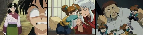 The Inuyasha group gather around the campfire preparing a very skimpy meal. Seems their money has run out. Of course, Shippo and Inuyasha have a little confrontation over who should get what. When the small fox demon loses out, Kagome generously gives Shippo her portion. Meanwhile, not far off, villagers have enlisted the help of the old woman exorcist, Haraiya. What could be scaring the villagers like this? The next day Inuyasha and the others approach the village, but no one seems to be needing help. Inuyasha wants to leave, but the others would like a bath, meal, and a warm bed. Just as Inuyasha questions how they are going to get money for that, Haraiya walks up to them. The group recalls when they first met this exorcist wannabe and quite honestly, can't believe that she has yet to retire. The old woman asks their help in solving the mystery of the demon who has been robbing the rich villagers and then making himself invisible to escape. Shippo guarantees his ability will solve this one. The group divides into two teams each staying in a rich villager's dojo. To Sango's amazement, Haraiya and Shippo are able to combine their powers to make Shippo disappear for a short time. The power works on her as well. Shippo and Sango venture out into the city believing they are invisible...which they are, but it eventually wears off. Hilariously, Sango has no idea that Miroku can see her. He is flirting with two women until his guilt gets the best of him. Sango is shocked when he gets on his knees and begs for her forgiveness. She believed no one could see her. Back at the dojo that Inuyasha's group is watching, Shippo is getting into mischief. Unbeknownst to him, his invisibility has worn off as well. (I laughed so much during this part!) Believing Inuyasha can't see him, Shippo taunts the hanyou using various means until Inuyasha gets pissed and smacks the small fox. However, Shippo believes that Inuyasha picked up his scent and still has no idea that he is no longer invisible. That evening Shippo is left to guard the scrolls as the others look for clues. It isn't long before a man paper thin makes his way into the dojo Shippo is guarding. Once inside the man converts into his real blubbery self. He grabs the scrolls. Shippo does his best to stop him. When the demonist man gets angry, Shippo finally realizes that he is NOT invisible! He runs calling for Sango and the old exorcist's help. They can't believe this huge man was able to get past them until they see him turn paper thin. It looks as if he disappears when he turns sideways. Inuyasha shows up and is able to grab the demon thief. "How?" the demon asks. The demon begs for forgiveness. They tell him that he must return what he has stolen. The demon's cave is full of stolen goods, but he resolves to return them and not steal again. An Ancestor Named KagomeComing Eventually! Mountain Of Demons: Survival of the DuoComing *sigh* Eventually! The Great Duel at Shoun FallsComing *sigh* *sigh* Eventually! Eternal Love, The Naginata of KenkonComing *sigh* *sigh* *sigh* Eventually! |