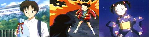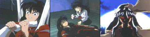 Kagome's in a hurry and promises her friends to help with school clean up next time. Upon exiting, she runs right into Hojo who has brought her another item for her so-called illnesses. Hojo asks Kagome to a movie on Saturday, and she shyly accepts (first date jitters). Back in the Feudal Era....InuYasha, Kagome, and Shippo set out on a small boat to search for jewel shards. While Shippo hangs off the side of the boat feeling seasick, Kagome asks if they can be back by Saturday. InuYasha says he thinks so and then asks "What exactly is Saturday?"...*chuckles*. Up ahead, InuYasha notices spider webs stretching across the river. Suddenly, a young girl plunges from a nearby cliff. InuYasha saves her but gets a less than grateful thank you from the young girl called Nazuna. Seems her parents were killed by a spiderhead causing her to detest all demons. When Nazuna attempts to leave, she injures her ankle. Kagome insists they help her back home. As the group approaches a large temple where Nazuna resides, they are greeted by an old priest. He strongly urges them to stay and rest for the evening and InuYasha (hesitating) agrees. After the sun goes down, InuYasha becomes nervous and claims he will sleep outside. Once outside, he discovers they are surrounded by Spiderheads...so much for the sutra's that the priest claims to have placed. Nazuna runs to locate the old priest, but finds him covered in webbing. InuYasha tries to fight, however, the tetsusaiga is not transforming. The young dog demon is half covered in webbing when the group flee the temple. Temporarily safe in the woods, Kagome pulls the webbing off InuYasha to find he has black hair and no dog ears....."he is human!" Myoga explains that half demons lose their supernatural powers at the start of each month when the moon is invisible. Kagome becomes upset that InuYasha didn't open up and tell her. Suddenly, there is a rustle in the bushes startling Shippo. It's Nazuna. She begs InuYasha to return to the Temple and save her master (a.k.a. the priest). At about the same time Kagome squeals....she has left her bag carrying the Shikon shards back at the Temple. InuYasha gives Kagome the tetsusaiga, grabs Shippo, and heads back. InuYasha arrives back at the Temple to find the priest taking the shards and evolving to a hideous spider demon. It binds InuYasha with his webbing and proceeds to pierce the poor hanyou's shoulder with a deadly poisonous bite. Kagome and Nazuna arrive and see the old priest's betrayal. Myoga tells Kagome that InuYasha has been poisoned. InuYasha is losing consciousness, but the last thing he sees is a brave and tearful Kagome breaking through the webbing with the help of the tetsusaiga. The group escapes to a small room thrusting the tetsusaiga into the door to ward off demons. Once inside, Myoga draws out as much poison as he can within InuYasha. Kagome notices InuYasha is dripping in a feverous sweat and places her handkerchief on his forehead. He awakens and weakly asks her why she had been crying? He is touched that she shed tears for him and asks if he could lay on her lap. Resting his head on her lap, InuYasha admitted she smelled good and he was lying when he said she didn't. He drifts off to sleep. Kagome's heart pounds unsure of the emotions she is feeling. It's not long before the priest spider demon breaks into the room devouring any remaining jewel shards and becoming even more powerful. An angry Nazuna grabs the tetsusaiga and attempts an attack.....not working....the demon grabs her and the tetsusaiga falls to the ground. InuYasha has awakened and picks up the tetsusaiga just as the sun is slowly rising. The evil priest spider grabs InuYasha only to find his demon days are over!!! The spider demon is destroyed releasing the jewel shards which have now fused together into one. Later Nazuna apologizes to InuYasha and says goodbye. As they venture down the river again, Kagome stares at InuYasha and recalls his behavior the night before. When the boy hanyou retracts with another sarcastic remark, Kagome just rolls her eyes and comments how he's back to his old self..... Kikyo's Stolen Ashes