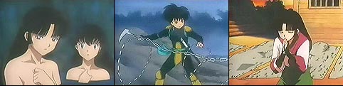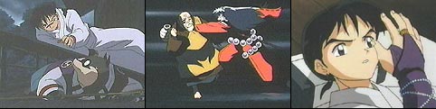 That evening Kagome and Sango bath in the Hot Springs while InuYasha and Miroku sit by a campfire discussing Naraku. Kagome notices the scar on Sango's back and asks if it was from a youkai. Sango shakes her head and tells the tale of her once gentle brother. She was thankful he knew who he was before he died. Suddenly, our demon exterminator picked up a rock and tossed it into the bushes. Surprise! It was simply a monkey. Unfortunately for the guys, they had heard the disturbance and came to see what happened. They got an eyeful and quite a beating. Ouch!