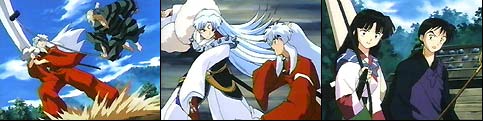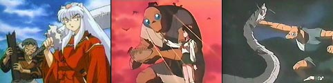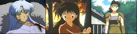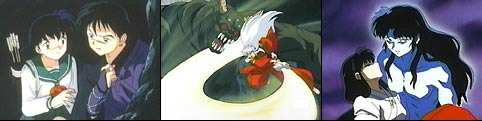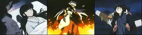 Leaving Miroku to watch over Sango, InuYasha and Kagome set out to find an herb to help cure Kirara. (As you recall in our last episode, Kirara had been poisoned by Naraku.) Myoga had told them there was a farm protected by a huge youkai and his mother outside the village. There they would find the herb that was needed. As InuYasha and Kagome approach the farm, they find some of the village men stoning the large youkai called Jinenji. Seems a demon has been killing the villagers, and they believe it to be him. InuYasha is surprised to see Jinenji run away timidly...calling for his elderly mother. She may be small and old, but this woman is feisty and packs a punch. After a rough start, Kagome and InuYasha introduce themselves and explain the intent of their visit. Once inside the woman's home, she explains that Jinenji is 1/2 demon (aka a hanyou) and how exactly she had met his demon father. She recognized that InuYasha was also a hanyou, so she knew he could relate to the torment Jinenji had experienced throughout his life. While she was talking, Jinenji had prepared an antidote for Kirara. As they were leaving, InuYasha noticed the villagers were preparing weapons to kill Jinenji. He vowed that he would find the true youkai that was doing the killing. Kagome stayed behind with Jinenji as InuYasha went on his quest. Jinenji felt a warm attraction for Kagome as they worked together on the farm. She was the first girl that he could talk to, and his appearance had not deterred her in any way. Meanwhile InuYasha has come across a hatched youkai's nest and knew that the parent is out teaching her young the taste of flesh. He fears for Kagome's safety and heads back Back at the farm, the villagers had grown impatient and started to attack Jinenji when the real killer youkai and her worm-like children make their appearance. Kagome tries her arrow, but the large youkai strikes her down. This sends Jinenji into action. When InuYasha arrives, the elderly woman tells him not to interfere. She wanted Jinenji to learn to fight on his own. InuYasha calls to Jinenji.."Show them your strength!" The battle ends with Jinenji slaughtering the deadly youkai. Then the sensitive hanyou offers the villagers herbs to help heal their wounds. The next morning the villagers arrive at the farm offering to help fix up the field. They have seen beyond Jinenji's appearance and looked into his kind soul. Kikyo and InuYasha, Into The Miasma