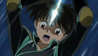 INUYASHA THE FINAL ACTCompleting the Shikon no TamaContinuing from the last episode, Magatsuhi's tentacles grab Kohaku before he falls to his death. Sango is able to cut them and retrieve her brother with the help of Inuyasha and Sesshomaru, who just arrived to join the fray. Sesshomaru uses his Bakusaiga and appears to destroy Magatsuhi. Knowing that this can't be over yet, Sango tells Sesshomaru how Miroku had absorbed some of Magatsuhi's evil poison, and Rin was affected as well. Sesshomaru heads straight for the village, but before the others can leave, Naraku appears and grabs Kagome. Naraku tells Kohaku he will release Kagome only when he is given the last shard. Kagome protests while noticing that she still has the ability to seek out the Shikon Jewel. "The jewel is in his right shoulder," Kagome tells Inuyasha. Inuyasha and Sango attack together, but were unable to get to the Jewel. Naraku had Moryomaru's armored shell protecting it. "Your shard will save Kagome's life," Naraku says to Kohaku. Pondering his next move, Kohaku notices one of Kagome's spiritual arrows. It's shinning and so is his shard. He has a plan. Even with everyone telling him to run, Kohaku allows himself to be captured. "Naraku, I'll defeat you! I will not die!" he says, plunging the spiritual arrow into the armored area protecting the jewel. "Curse you!" Naraku says knowing that he'll be purified if the boy continues to touch him. He releases the boy. Before Naraku can disappear, Inuyasha is able to use "Adamant Barrage" to save Kagome. His body shattered again, Naraku escapes into the clouds. Meanwhile, Miroku is feeling much better. It was as if something was lifted from his body. Outside Kaede's, Rin is not so lucky. Her body possessed, she flies off on a demon before Jaken can do anything about it. As soon as Sesshomaru gets to the village, Lady Kaede informs him of what happened to the child. Jaken feared he would be blamed, but Sesshomaru sped off quickly...more concerned with finding Rin. Returning to the others, with Naraku gone, it would seem that things would be peaceful for a while, but in a flash, a small bit of Naraku's demon flesh strikes through Kohaku's neck taking the last shard. The boy's life force is gone, and he crumbles to the ground. Sango tearfully cradles her younger brother. Naraku gazes at the completed Shikon Jewel and takes satisfaction in knowing that it is completely defiled (Kikyo's light could no longer be found.). He taunts Inuyasha saying that he is weak and unable to save either Kikyo or Kohaku. The light of dawn slowly appears. Inuyasha is beating his fist on the ground in frustration when, suddenly, both Kagome and Sango notice a light emanating from Kohaku. To everyone's surprise, the boy awakens. Seems Kikyo decided it was more important to save Kohaku's life than to destroy Naraku. Kagome looks up at the sky realizing it's all up to them now.