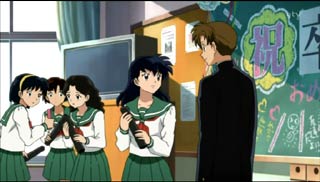 INUYASHA THE FINAL ACTInto the Body of NarakuAfter recapping events from 50 years ago, Naraku uses the defiled shikon jewel and transforms into a hideous, demonic spider. As he is transforming, Rin is absorbed into his body. Back in present day, Kagome has found out that she was accepted into high school and is graduating with the rest of her middle school class. At the graduation ceremony, Hojo wants to present Kagome with the second button from his uniform, but she races off before he is able to detach it and tell her how he feels. Kagome was anxious to get back to the Feudal Era. Meanwhile, Miroku, Sango, and Inuyasha watch from the Village as a huge mushroom cloud forms in the distance attracting demons. When Kagome shows up, the group set off to destroy Naraku. Shippo is told to stay behind, and he is not pleased about that. Kohaku stays behind as well. When they arrive at Naraku the spider's destination, they find Sesshomaru already there. The group are surprised to see the spider open up his body for them. Sesshomaru enters the spider without hesitation when Byakuya informs him that Rin is inside. That prompts Inuyasha and the others to enter as well. "Let's defeat Naraku," a determined Sango says to Miroku. From inside the body, every swing of the tetsusaiga or attack from Sango's Hiraikotsu brings a release of poisonous miasma. Even so, Naraku is feeding on their hatred for him and creating incarnations of himself for them to fight. When the incarnations appear endless, Inuyasha prepares to use Meido Zangetsuha. That's when Naraku shows them an image of Rin walking around aimlessly. Inuyasha knows he cannot use the Meido attack or Rin, too, will be sent to the Netherworld. Kagome says they must find the shikon jewel and destroy it in order to destroy Naraku. In doing so, they are separated from Miroku and Sango. As they get closer to the jewel, Inuyasha's body suddenly illuminates indicating his change into demon form. He turns and lashes out at Kagome injuring her arm. By getting closer to the defiled jewel, Inuyasha has changed into full demon form and is no longer in control of himself. Naraku offers Kagome an arrow coated in miasma, but she refuses to use it against Inuyasha. She teeters on a ledge inside Naraku's body. When demon Inuyasha swings his deadly claws at her, Kagome plummets downward. This doesn't look good for poor Kagome. Where is Sesshomaru? The next episode should prove to be very exciting!