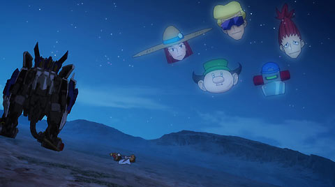 Drake ("Insta-Kill" Drake their boss) shows up with his Zoid, the rare Deinonychus-type, Gilraptor. The Liger saves Arashi when Drake sends Gilraptor to capture the boy. Arashi is so clueless and impressed with Drake's strength. At first he wants Drake to join Team Stretchy, but then he realizes that Drake is even cruel to his own Death Metal crew and their Zoids.