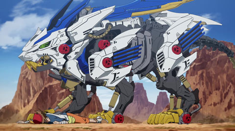 The next day, Death Metal arrive just as the competition between the Wild Liger and Grachiosaurus is taking place. They want the Wild Liger to be used as a tool to conquer the World. Arashi says the Liger is not a tool but his precious partner. Wild Blast! The Wild Liger's king of claw sends the Death Metal Zoids out of the arena! When the platoon Leader wants to take the Villagers hostage, Kuroame steps in. Smash them, Grachiosaurus with my soul. Wild Blast! The 3rd Platoon Commander, Azas, and his 2nd in commands, Zamas and Sodas get blasted away (like Team Rocket in Pokemon).