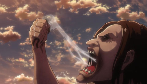 Hannes orders the recruits to scatter when he sees charging Titans heading straight for them baited by Erwin. When the Armored Titan is attacked by the arriving Titans, Erwin orders a charge but is carried away by his arm in the mouth of a Titan.