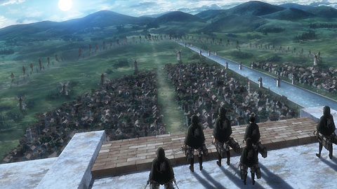 With extended claws on both his feet and hands, the Armored Titan begins climbing the wall were Erwin and his troops are standing. Meanwhile, the Ape/Beast Titan sends the 2 & 3 meter titans in to destroy the horses so there is no escape. Their main objective is to get Eren.