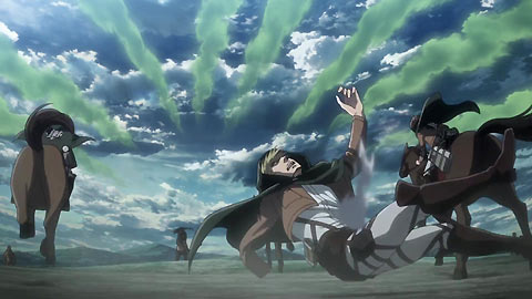 Picking up from last episode; things do not look good for the Survey Corps. Commander Erwin has led a suicide charge as a diversion so Captain Levi can take down the Beast Titan. "My soldiers, rage! My soldiers, scream! My soldiers, fight!" In the first stage, Commander Erwin is mortally wounded. The men continue their charge only to see Marlowe and many more perish at the hands of the Beast's pitching arm. Finally, the Beast finishes off the remainder of the selfless men and women. Just when he notices that his Titans have fallen, the Beast gets a taste of Captain Levi's wrath! (Reiner and Bertholdt warmed him about Captain Levi's strength!).