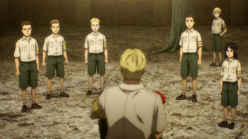 Emerging from recollections of his past, Reiner attempts suicide, but stops after hearing Falco outside. He then tells himself that he needs to live because of his role as a mentor to Falco and the other Candidates.