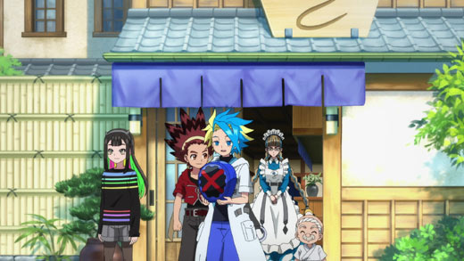 Next, it's Bird who faces off against the young Cho Pan. Her Bey, Rhino Horn, bursts Hells Scythe.