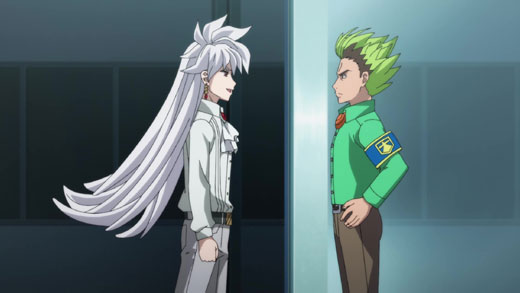 After a bey battle, an alarm suddenly sounds and a mysterious figure flies in to celebrate the completion of Burn's new bey!