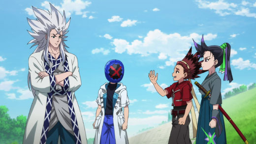 After Ginrou spectacularly blows away two black-clad underground Bladers, he attempts to recruit Ekusu into the battle to protect the world from the underground pros. However, Tenka stands in his way, refusing to let Ekusu enter the underworld.