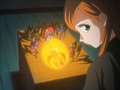 Orihime and Uryu continue towards Rukia's location, but are accosted by Makizo Aramaki, a Soul Reaper of the eleventh division. Some twelfth division members arrive to help, but Mayuri, who has made them into human bombs, detonates them. Orihime uses her powers to protect Uryu and herself from the explosions, and Mayuri expresses his wish to experiment on Orihime. Uryu begins to fight Mayuri, but is quickly disabled by the paralyzing abilities of Mayuri's zanpakuto when his lieutenant, Nemu Kurotsuchi, uses her body to hold down Uryu. Mayuri then reveals that he has experimented on many other Quincy, including Uryu's grandfather, Soken Ishida, and was responsible for his death.