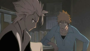 In the World of the Living, Ichigo Kurosaki, a Substitute Soul Reaper who lives in Karakura Town, happens to find the unconscious Captain Hitsugaya. Ichigo takes the captain home and lets him rest. When Captain Hitsugaya wakes up, he tries to sneak out, but Ichigo notices his attempt to leave. The captain threatens Ichigo with his zanpakuto and disappears again. And when the Soul Reapers sent to find him catch up to him, Captain Hitsugaya once again draws his sword on his comrades and flees..