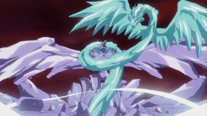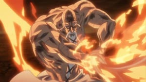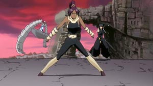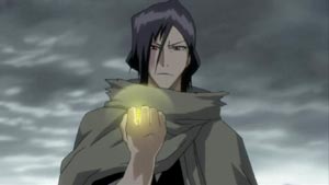 Just about all members of the Soul Society have arrived. Ichigo and the recovering Captain Shunsui show up and defend Toshiro. (Of course, there's a lot of that sappy, "Don't do things alone...we're here for you" bla..bla..bla.) With everyone watching, Kusaka breaks the seal himself and transforms into a mighty ice-like beast.