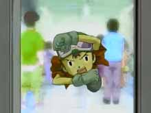 When he finally arrives, he remembers that he doesn't have more money and that he should have asked for more allowance. Exasperated, he slams his head against the ticket machine, receiving in return a red ticket with an odd shine about it. Believing it to be destiny, he runs onto the train and collapses from exhaustion. As he notices that a billion cell phones are going off at the same time, he soon observes that a boy his age pulls out his cell phone before a new message arrives, telling him to transfer to the 6:00 westbound train at Shibuya station. He glances at some guy's watch to see that it's 17:54 (5:54 P.M.) before screaming in frustration. The other boy stares at him like he's crazy. (Note: this scene is somewhat different in episode #22. In that, the other boy stares at Takuya as he collapses, not after he screams.)