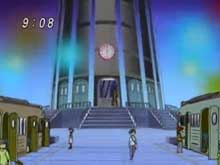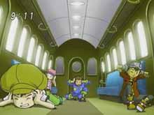 The elevator lands, and Takuya mutters something about no more landing on his head. They are greeted with several kids and several trains. The voice on the phone informs, "It's up to you now. Which one will you choose?" Koji darts past without a single word to Takuya, who just wants to have some idea of where to go. His reaction? Takuya: "Geez, my phone talks more than that guy."