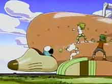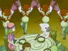 Back at the village, Fairymon tries her best attacks on Woodmon, but he overpowers her.