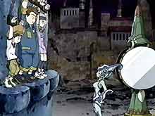 Meanwhile, Koji is staggering around the Digital World unable to understand why Duskmon hadn't finished him off. He comes to a clearing where he sees Zoe, J.P. and Tommy are held captive by Mercuremon and Ranamon. In another area, three Nanomon are trying to pry open the children's digivices to get the spirits. Ranamon wants to try some torturous tactics to find the where-a-bouts of the other two children. She uses the tickle method and sends Zoe and Tommy into fits of laughter. When that doesn't work, she puts a dark cloud around J.P. Koji can't watch any longer, and he evolves to Lobomon to defend his friends.