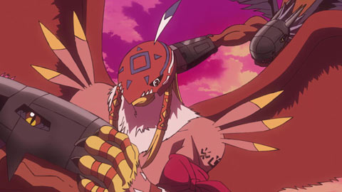 Taichi manages to get the enemies to chase him, but a new threat, Parrotmon, has joined the fray. Just when it looked like the Parrotmon and MetalGreymon were equally strong, Parrotmon evolves into Crossmon.