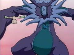 Antylamon then dives for the water and Gargomon goes after him. Both of them are standing on the water (How'd they do that? Does anyone have any idea how much they weigh?), then Antylamon disappears. The whole canyon starts glowing and a mega level Digimon emerges from the water: Kerpymon (he's actually Cherubimon with a different name in case you don't know). He throws some kind of black balls at the Digidestined Digimon, and they de-digivolve into their rookie forms. He then grabs the Digimon and starts juggling them. Willis says that it's his fault and Davis asks, "Why, are you the one who taught him to juggle?" The Digimon try to destroy him, but every time Kerpymon gets hit he just regenerates.
