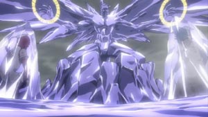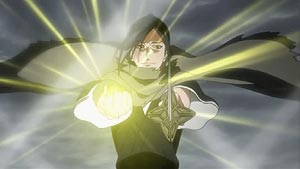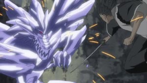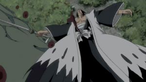 Just about all members of the Soul Society have arrived. Ichigo and the recovering Captain Shunsui show up and defend Toshiro. (Of course, there's a lot of that sappy, "Don't do things alone...we're here for you" bla..bla..bla.) With everyone watching, Kusaka breaks the seal himself and transforms into a mighty ice-like beast.