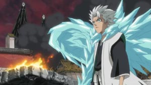 With his squad and everyone's backing, Toshiro again wears his Captain's robe. He, along with the Soul Society and Ichigo, begin to battle the transformed Kusaka and a magnitude of attacking hollows.
