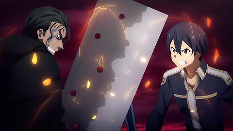 Kirito fights Vassago and with the help of Eugeo's spirit, they work together to use the power of both swords to log out all red players. Kirito then uses the power of the residual life force to restore Eugeo's sword and transform to his old SAO avatar.